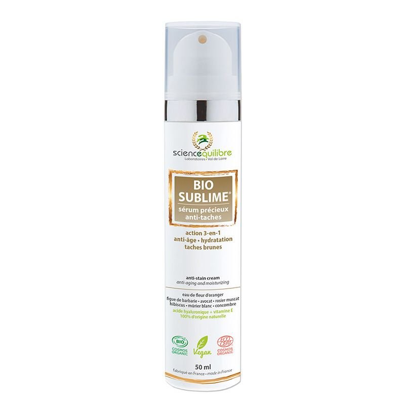 BIO SUBLIME Sérum Précieux Anti-Taches est une solution bio innovante qui offre une action 3-en-1 contre les taches brunes, le vieillissement cutané et la sécheresse de la peau. Enrichi en extraits de mûrier blanc, concombre et hibiscus, il aide à éclaircir le teint et à réduire l'apparence des taches pigmentaires. Les huiles végétales de rosier muscat, avocat et figue de barbarie nourrissent et hydratent la peau en profondeur, tandis que l’acide hyaluronique repulpe la peau pour lui donner un aspect plus jeune et lumineux.