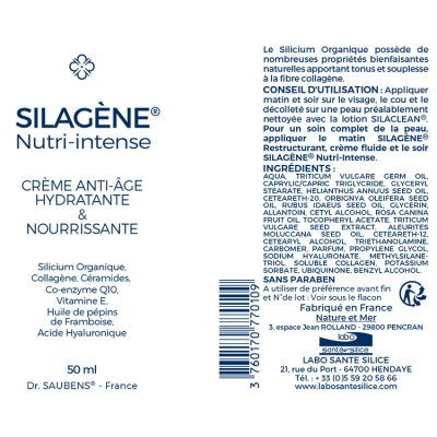 Grâce à sa synergie d’actifs hautement performants, SILAGENE Nutri-Intense agit simultanément sur l’hydratation, la nutrition et la régénération cellulaire. Le Silicium Organique stimule la production de collagène et d’élastine pour raffermir la peau et lisser les rides. Le Collagène Marin renforce la structure cutanée et apporte un effet tenseur visible. Les Céramides et l’Huile de pépins de Framboise restaurent le film hydrolipidique, protégeant ainsi la peau de la déshydratation et des agressions extérieures.