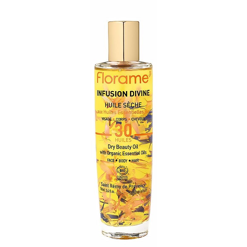 L’Huile Sèche Infusion Divine certifiée bio Florame est un soin multi-usages pour le visage, le corps et les cheveux. Sa texture soyeuse et non grasse pénètre rapidement pour un fini doux et agréable. Enrichie en 30 huiles végétales et essentielles bio, elle nourrit intensément, protège et apporte éclat et confort à la peau et aux cheveux. Son parfum 100 % naturel élaboré à Grasse offre une expérience sensorielle raffinée. Certifiée COSMOS Organic et fabriquée en France, cette huile sèche combine efficacité, plaisir et naturalité pour un soin complet au quotidien.